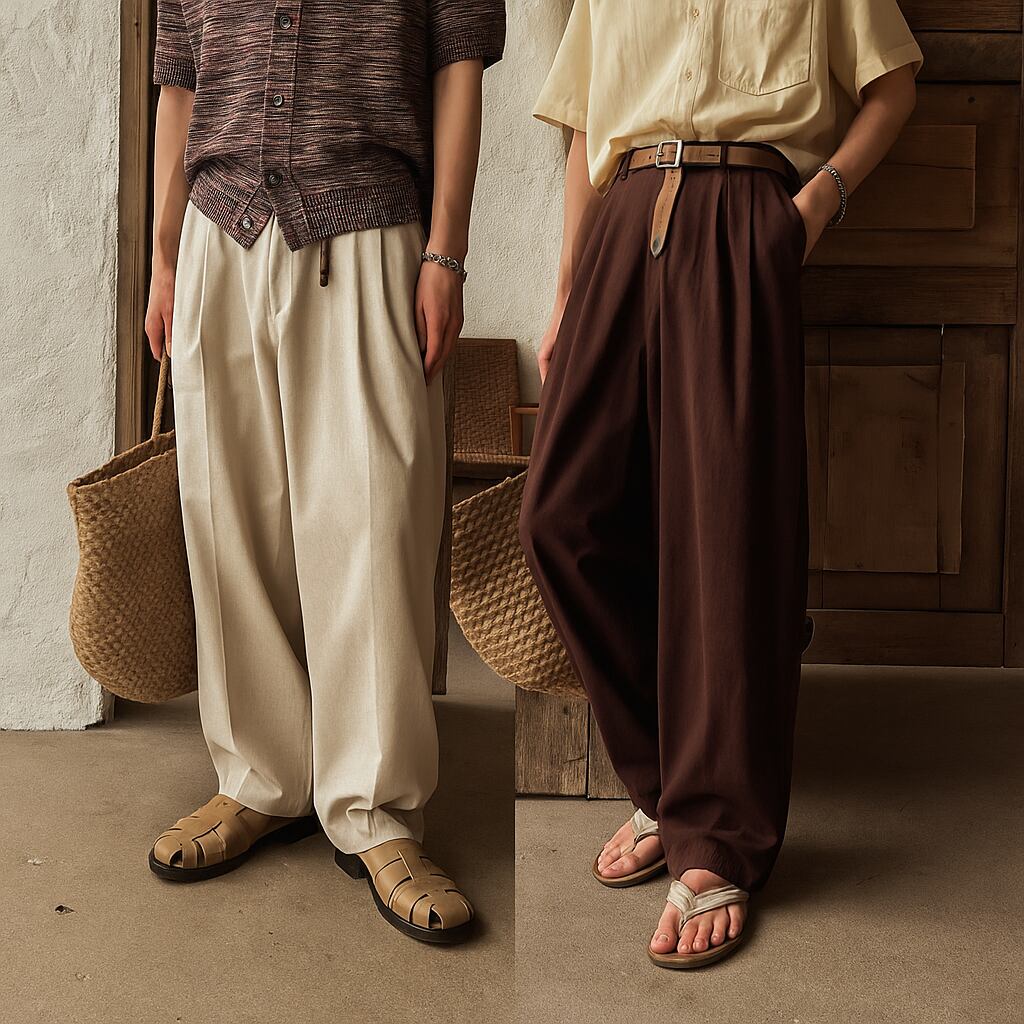 通気性に優れた麻混素材で、暑い季節も快適な履き心地。リラックス感のあるシルエットながら、洗練された韓国風デザインで都会的な印象を演出します。