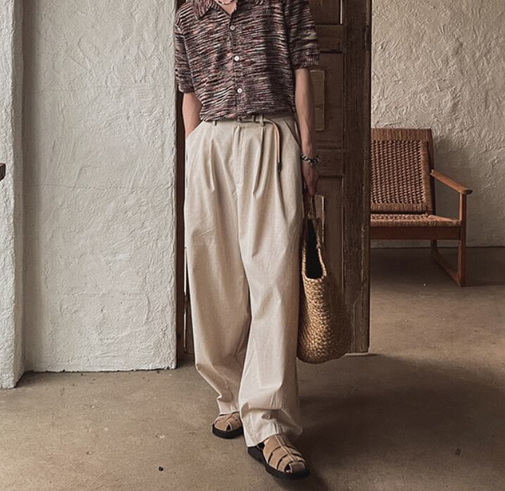 通気性に優れた麻混素材で、暑い季節も快適な履き心地。リラックス感のあるシルエットながら、洗練された韓国風デザインで都会的な印象を演出します。