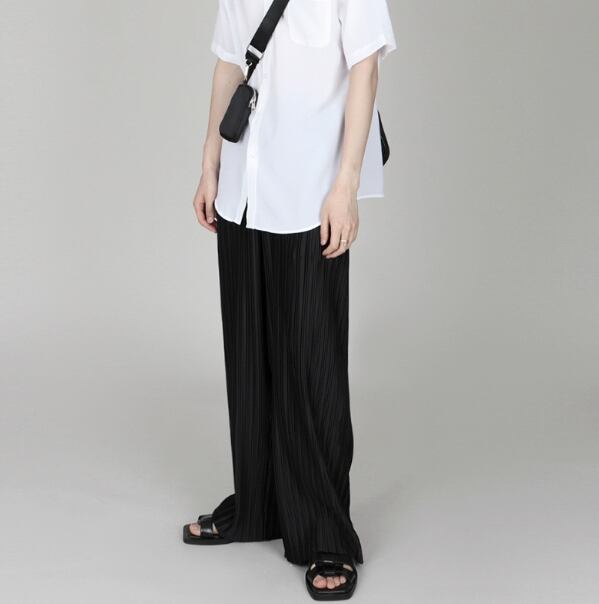 夏にぴったりのアイスシルク素材を使用した、韓国系ストリート風ワイドパンツ。