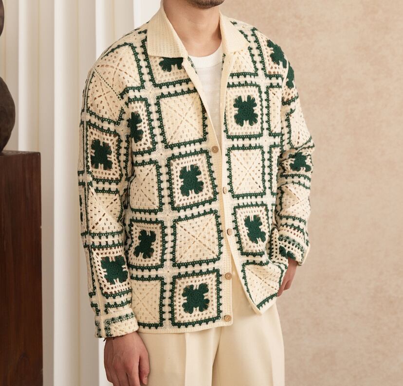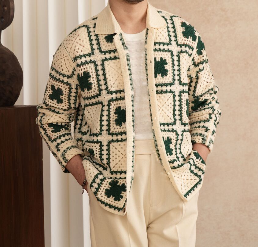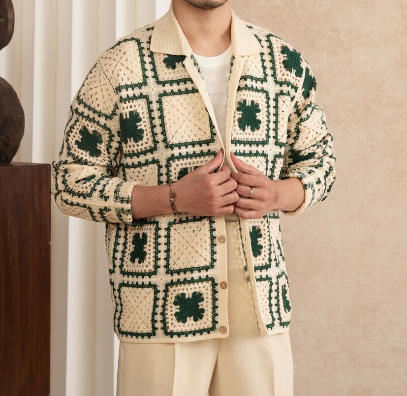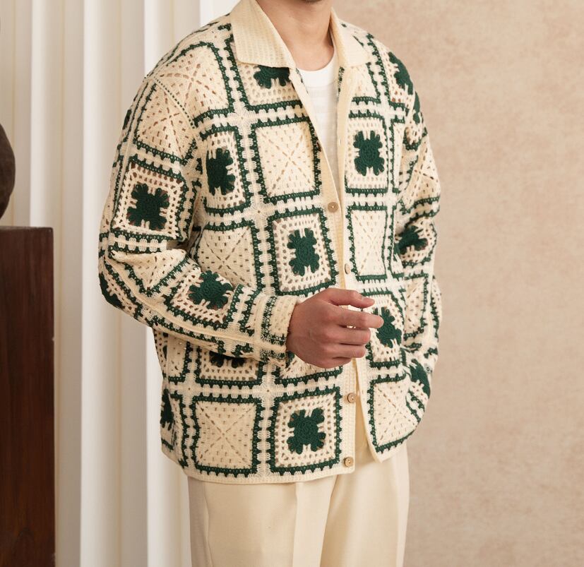 レトロ幾何学柄 ニットカーディガン メンズ 長袖 羽織り 2カラー展開 #グリーン