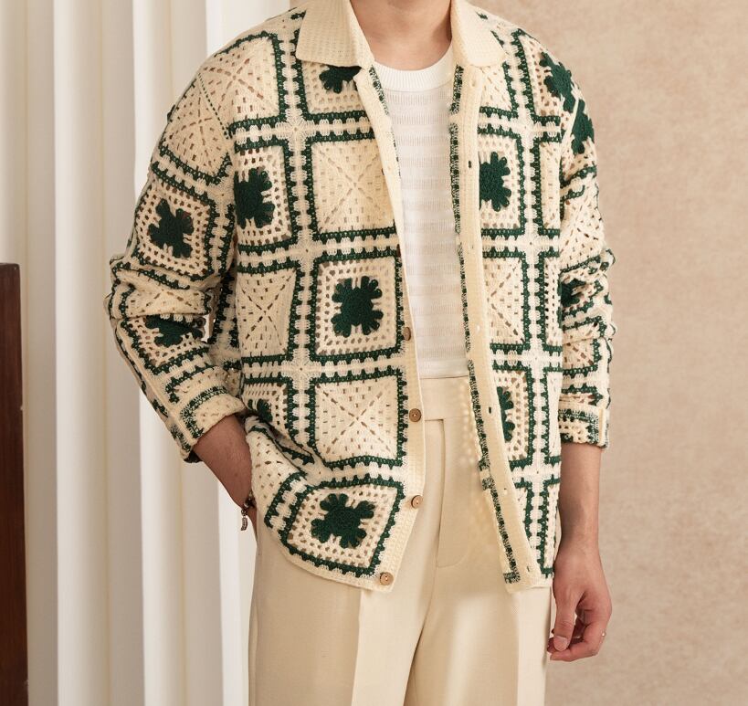 大人のカジュアルスタイルに映える、レトロ幾何学模様のニットカーディガン。