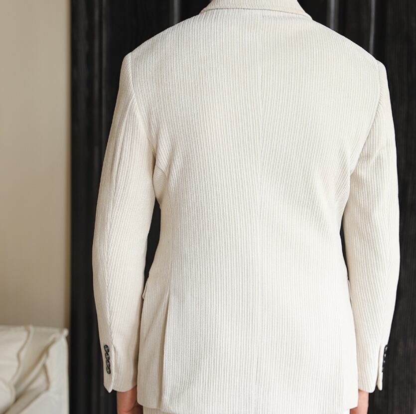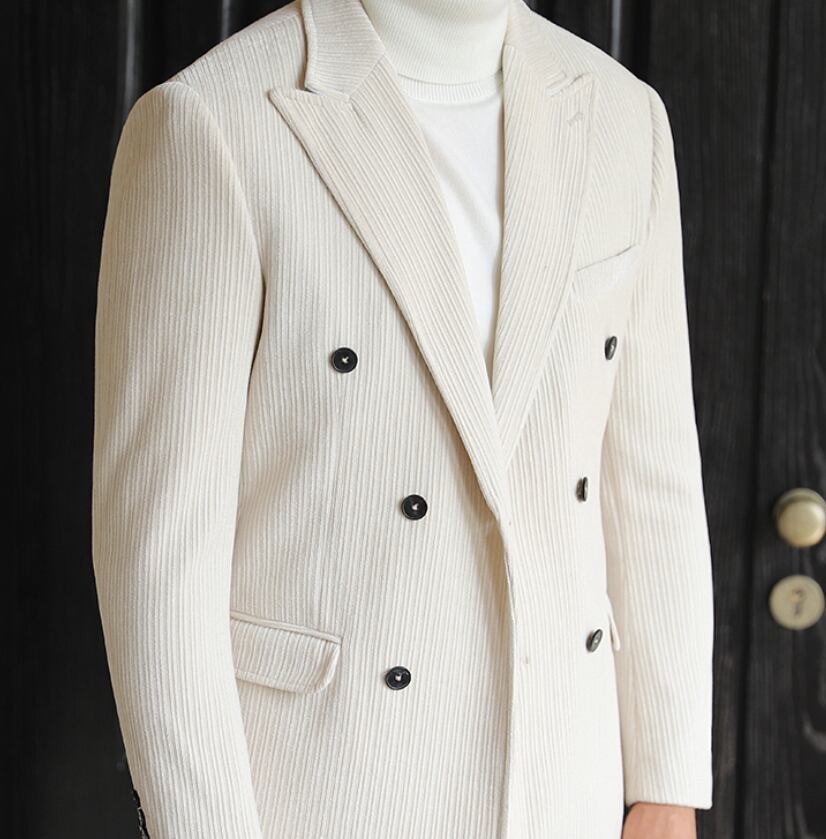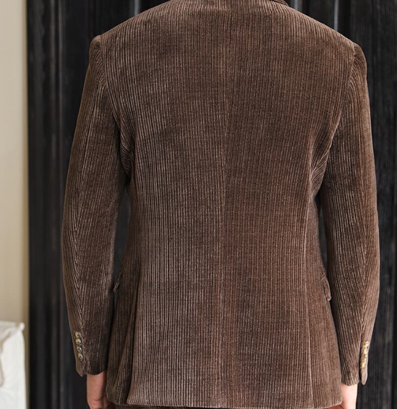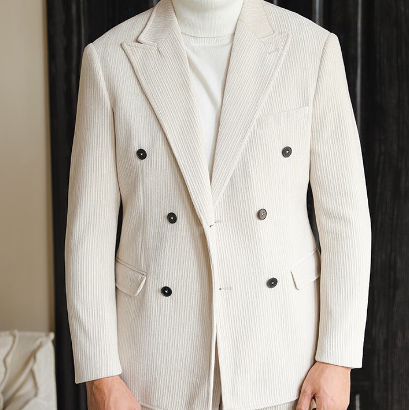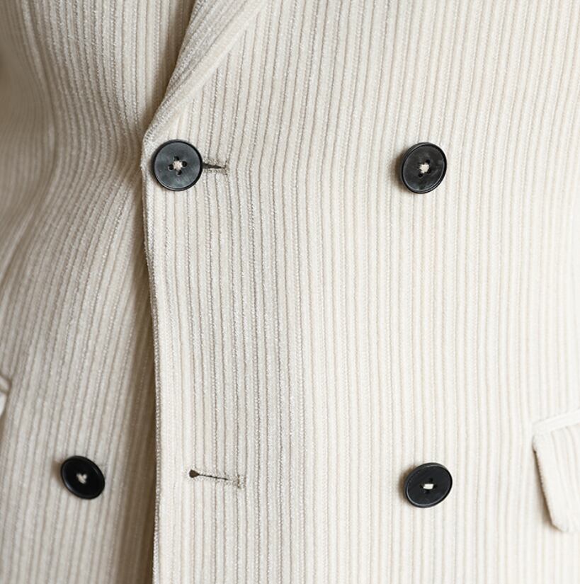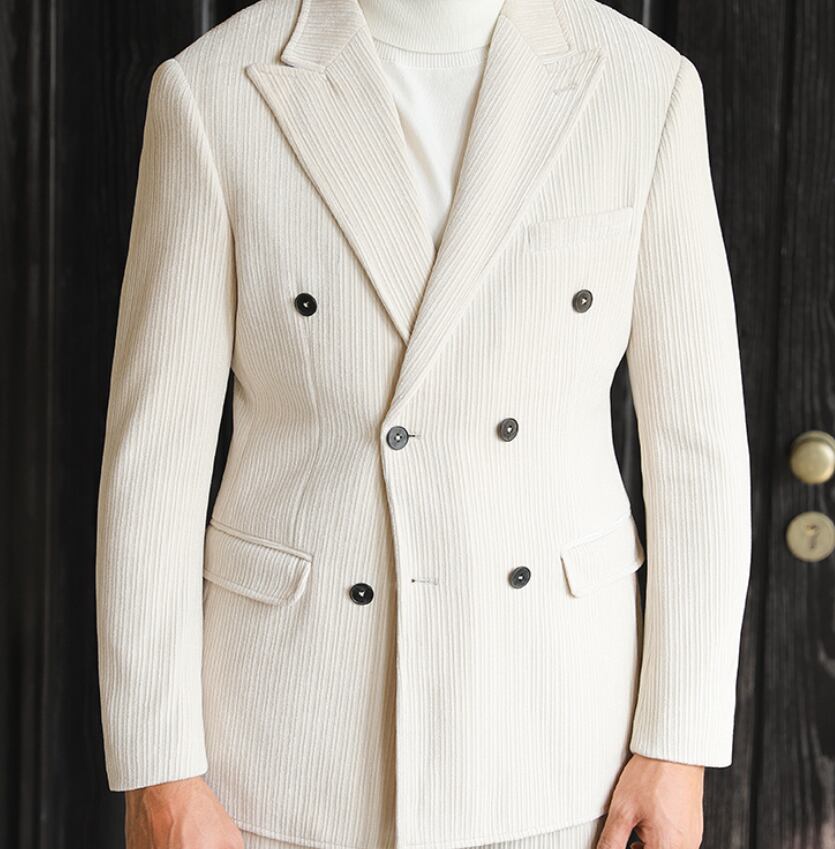 シンプルながらも存在感のあるワイドピークドラペルと二列ボタンが、大人の色気と洗練された雰囲気を演出します。