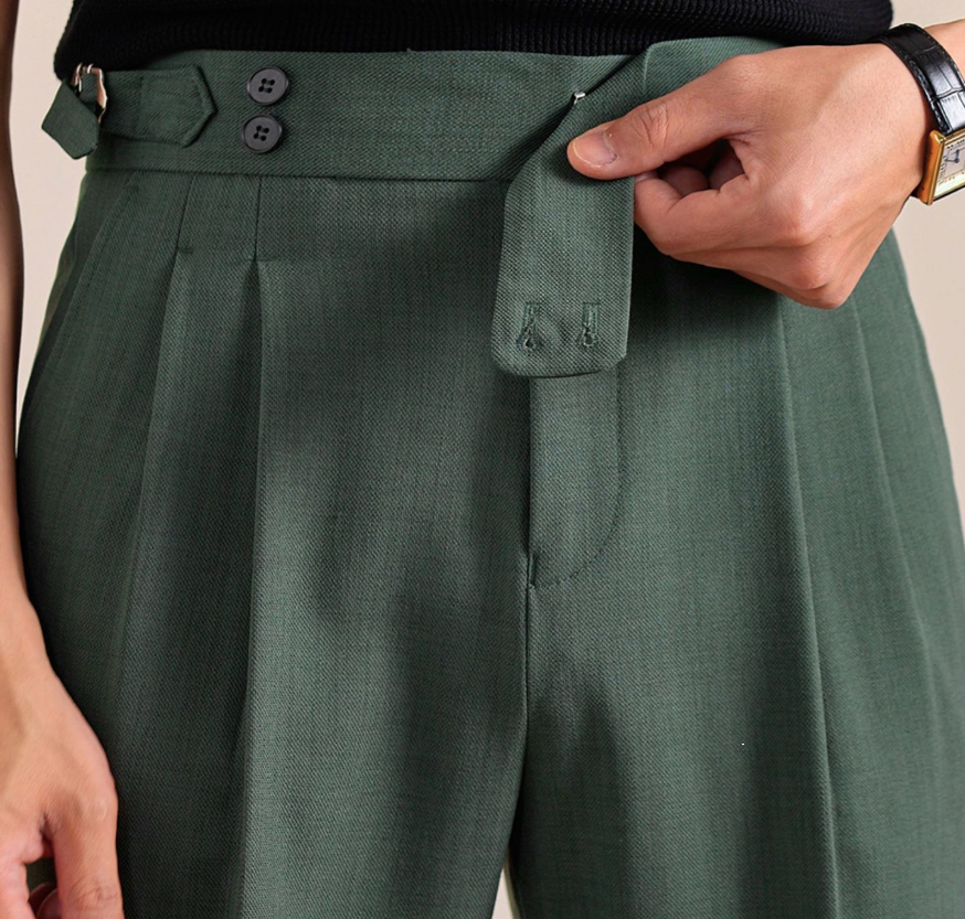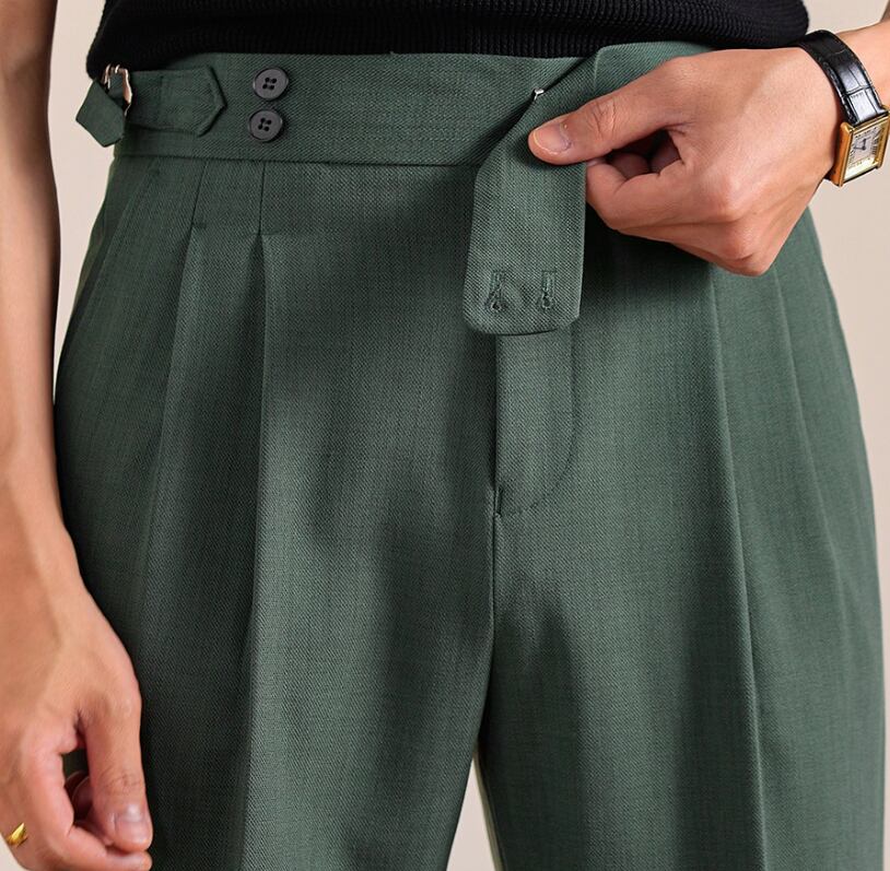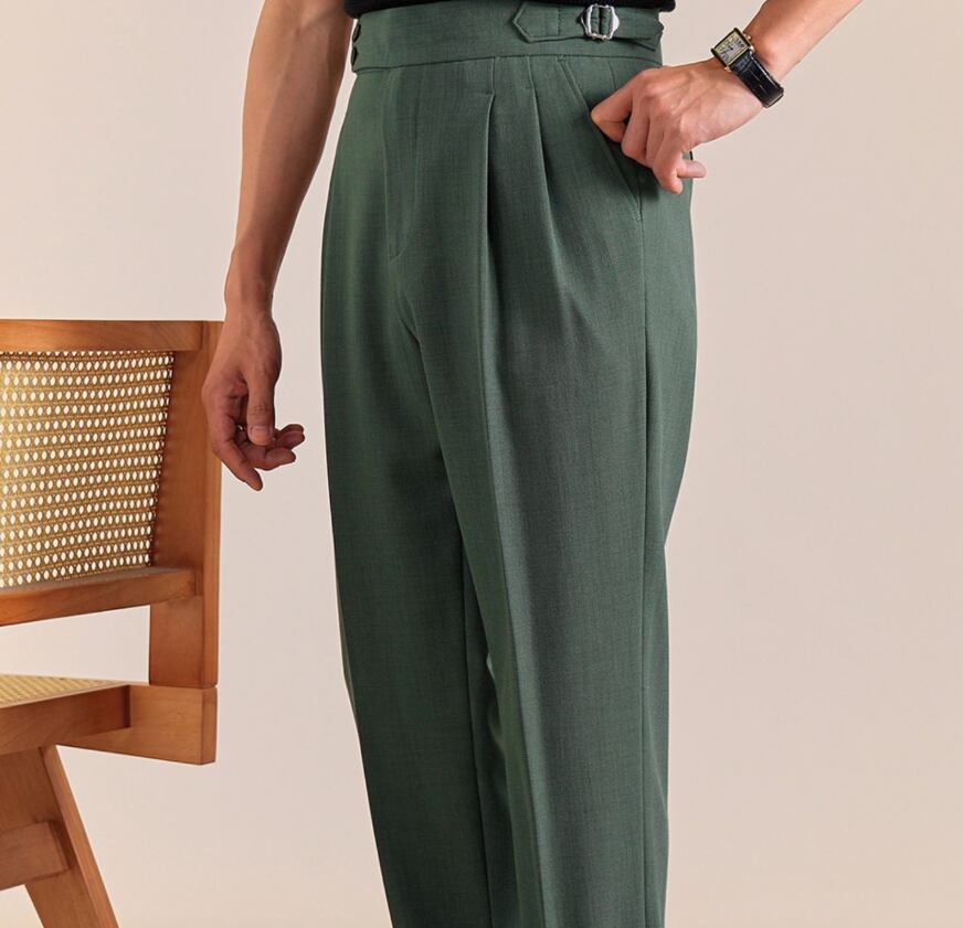 【秋冬新作】ブリティッシュグリーン・フォールブラウン・ジェットブラック ウール混 ハイウエスト ダブルバックル スラックス メンズ イタリアンスタイル