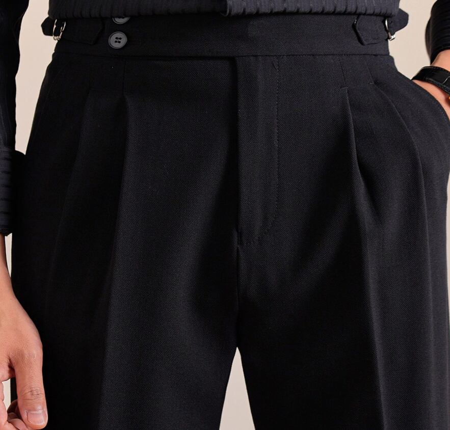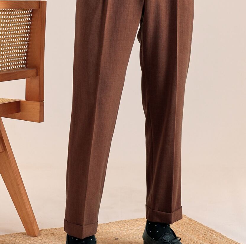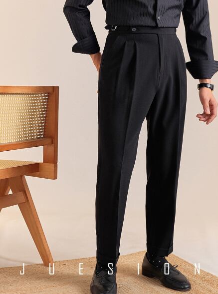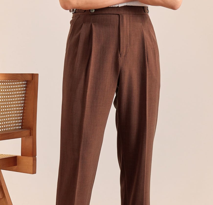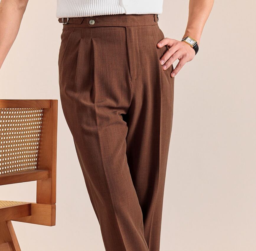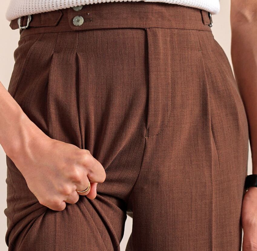 イタリアンスタイルをベースにしたハイウエストのダブルバックルスラックスは、クラシックな雰囲気と都会的な洗練を兼ね備えています。