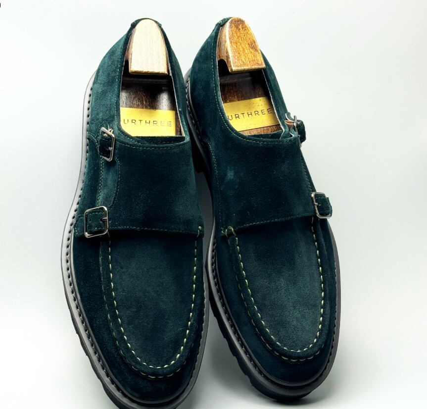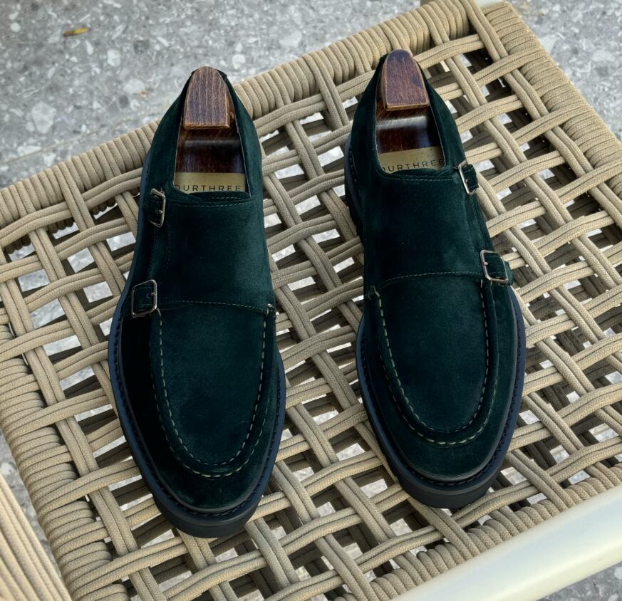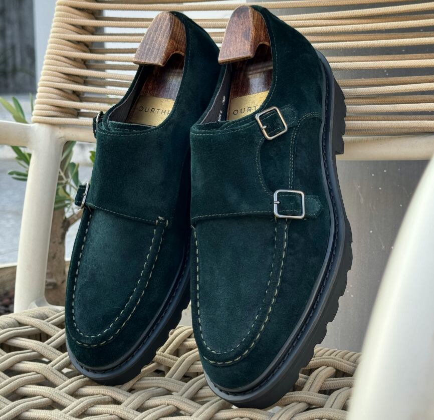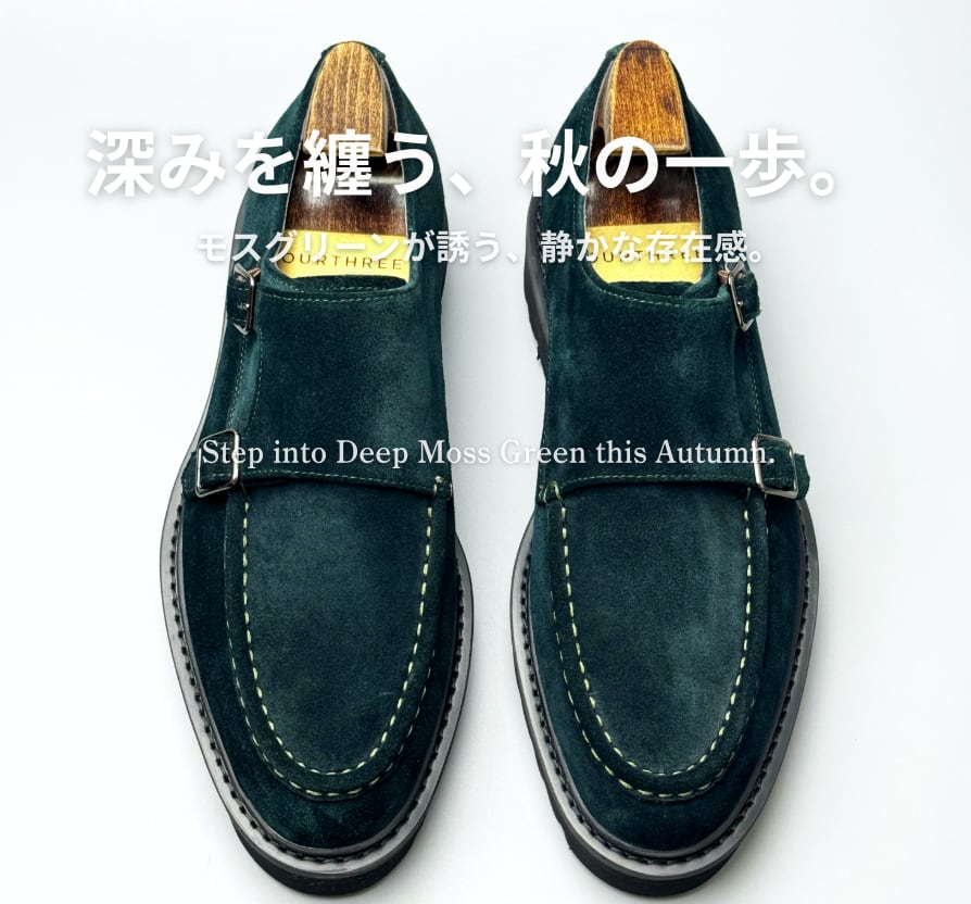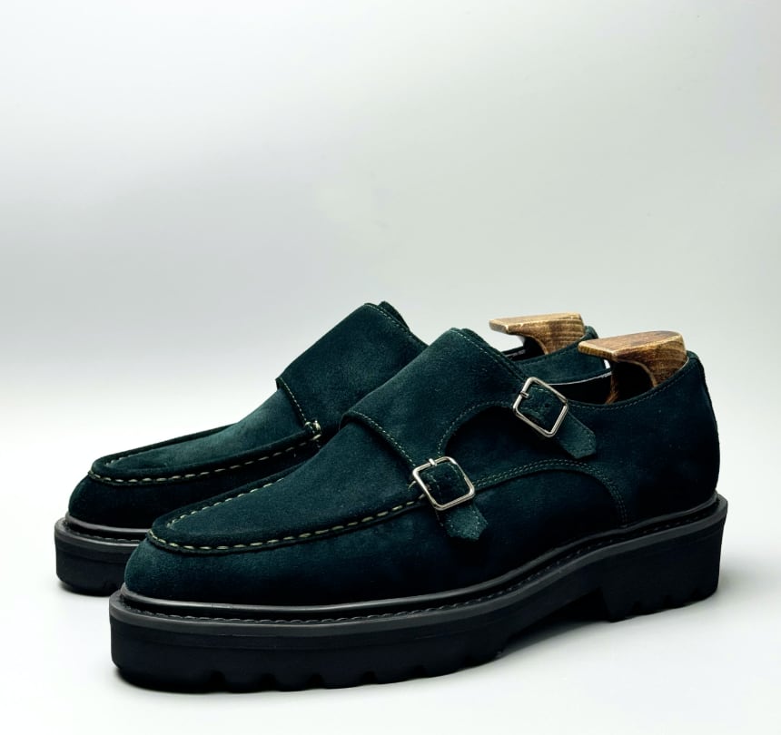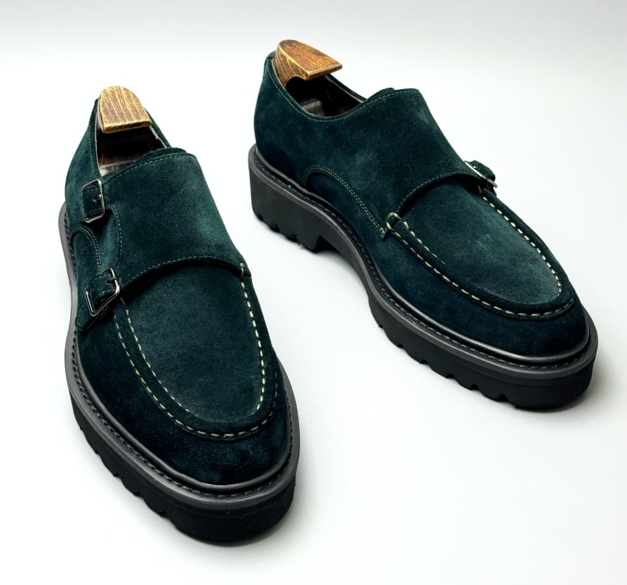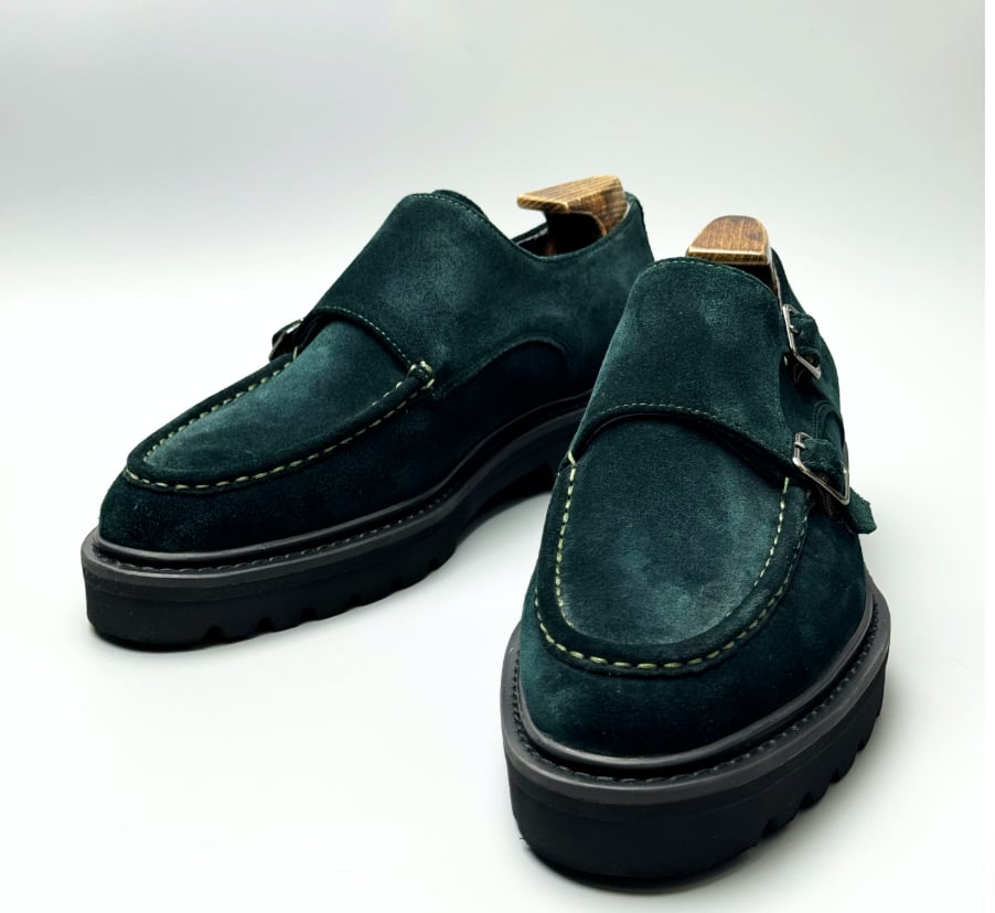 ダークグリーンのスエードを贅沢に使用した、