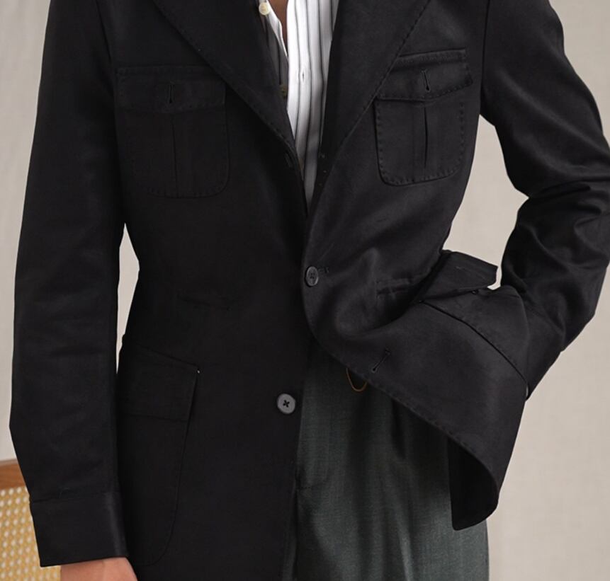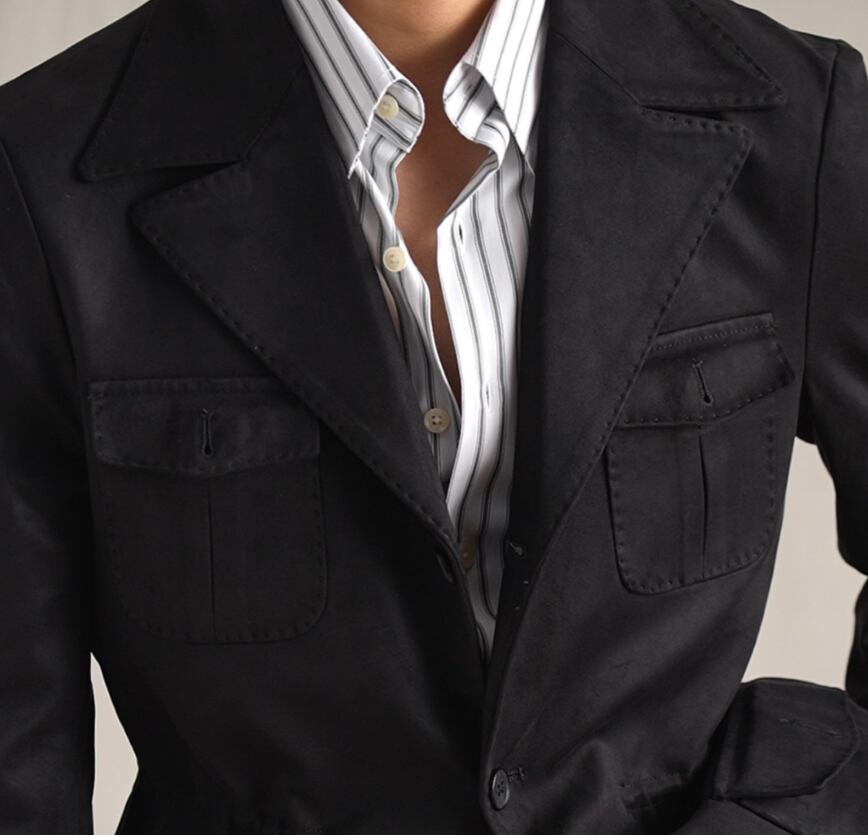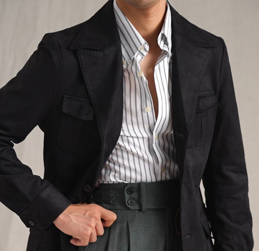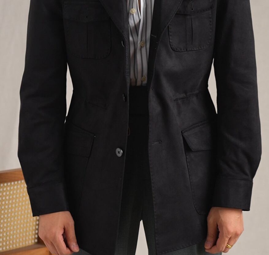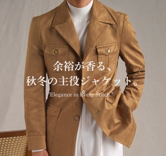 上質な340g/m²スエード調生地を使用した、イタリアンスタイルのサファリジャケット。