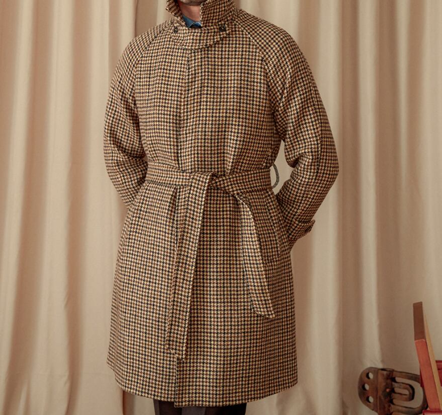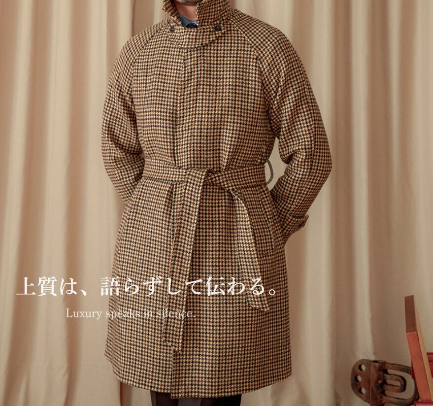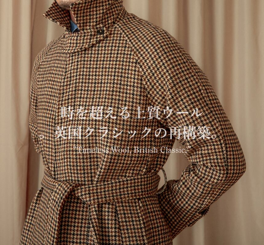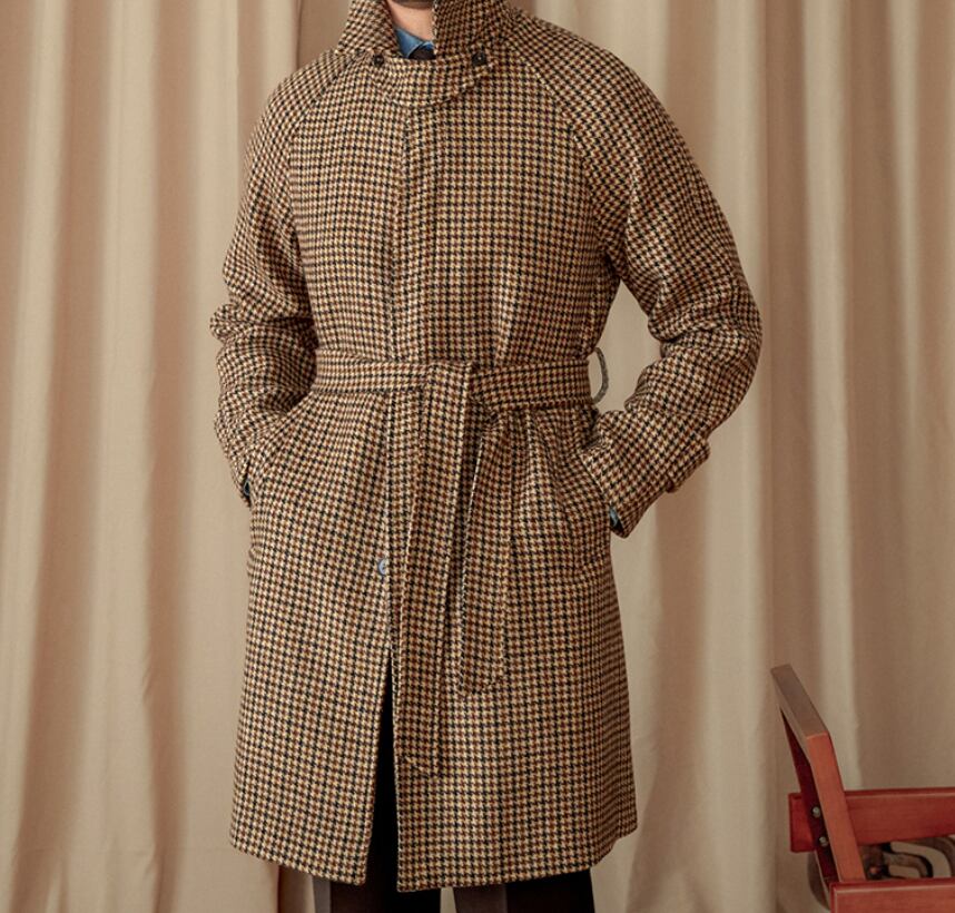 英国調ウールロングコート メンズ 秋冬|千鳥格チェック バルマカーンコート ベルト付き ロング丈 アウター 上質ウール100% クラシックスタイル