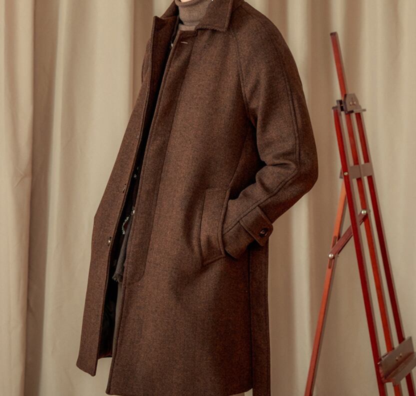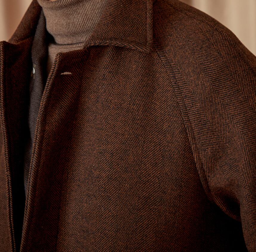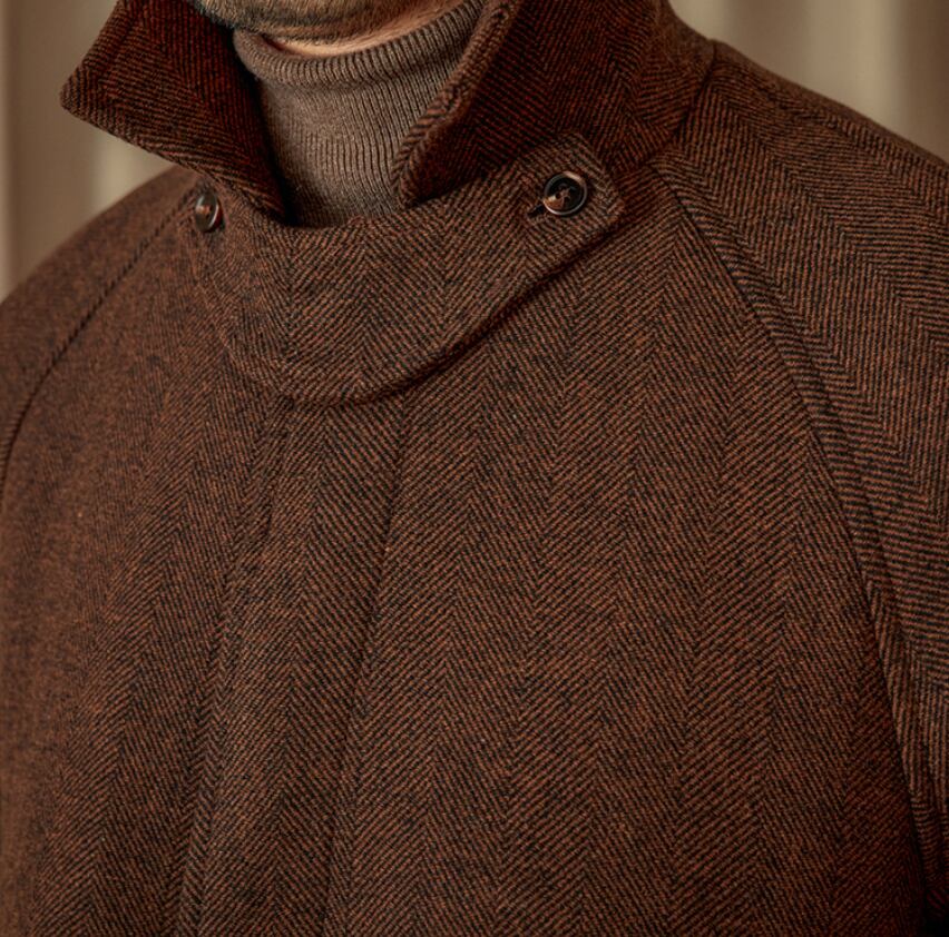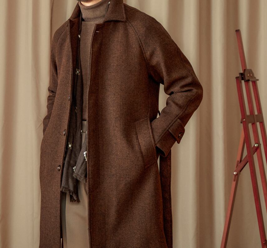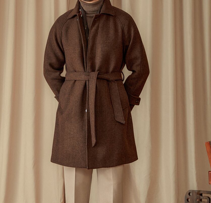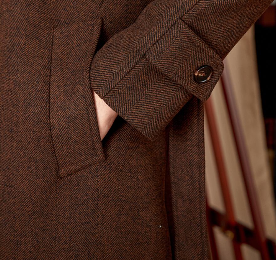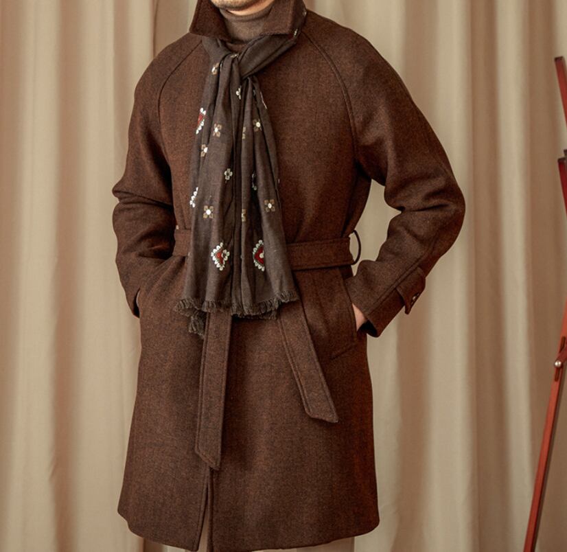【DEZAIN】プレミアム 80%ウール ヘリンボーン ベルト付きスタンドカラーコート|ロング丈/高保温/上質ブラウン