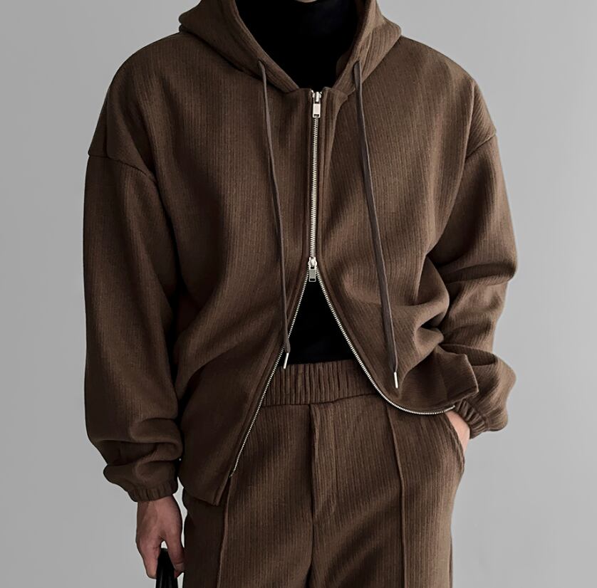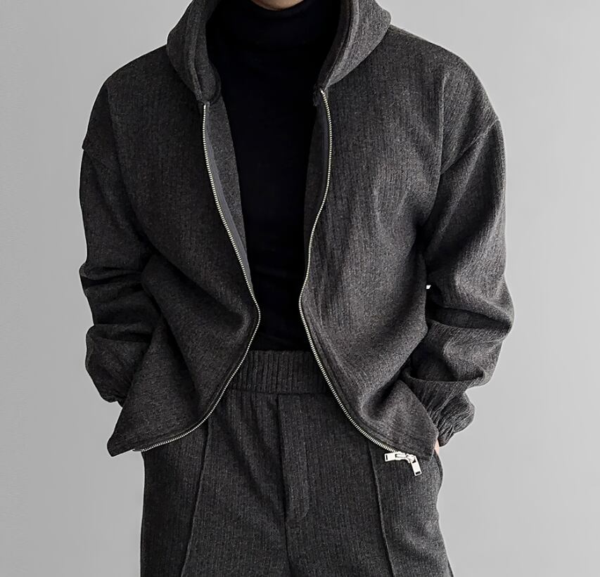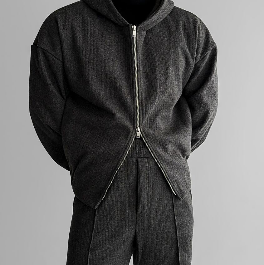 《韓国ストリート×上質ウール調》ヘビーウェイトジップアップフーディージャケット|秋冬メンズセットアップ対応|大人ミニマル・上品カジュアル