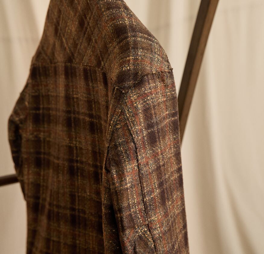 表面に浮かぶ多色のチェック糸は、光の角度で表情を変え、