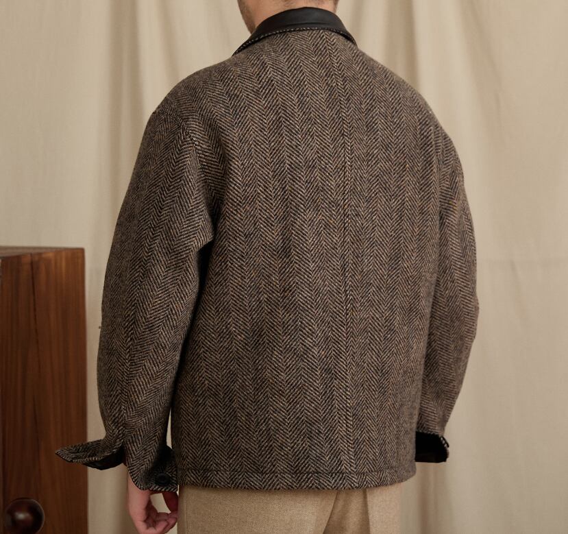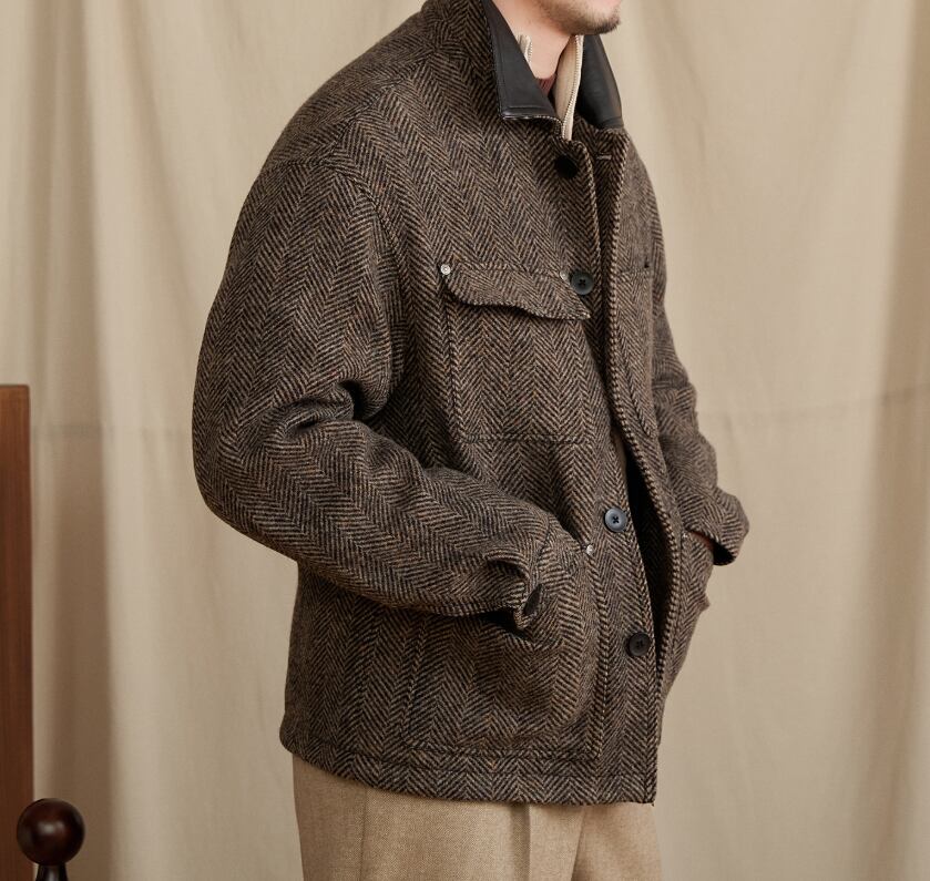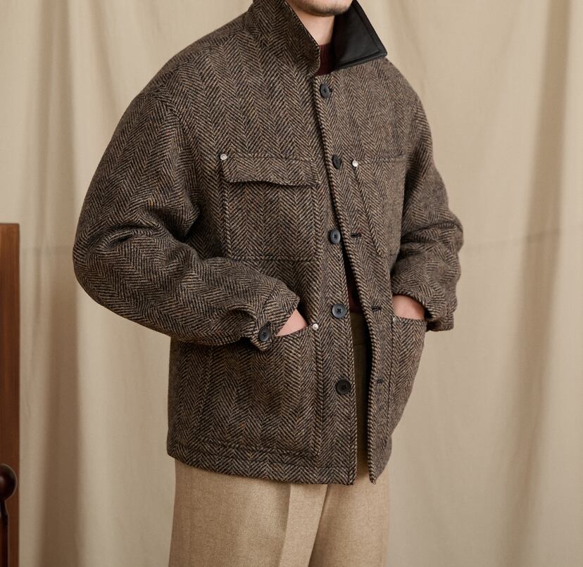 クラシックな人字柄(ヘリンボーン)で織り上げたショートブルゾン。